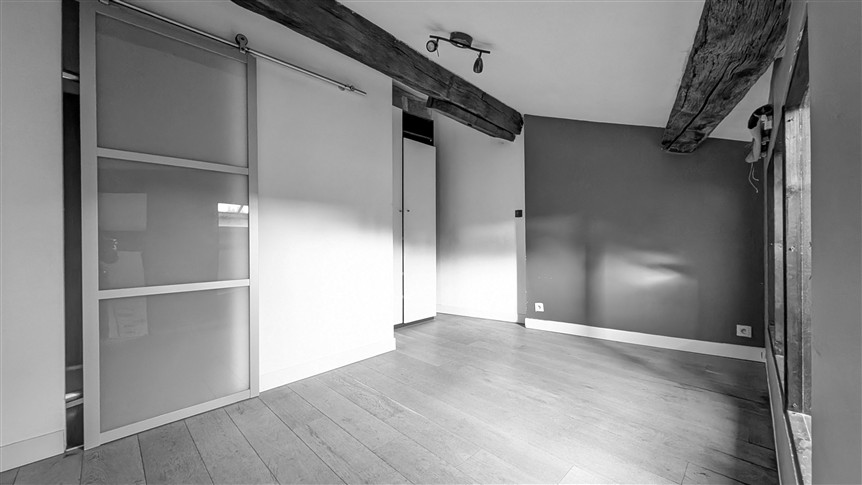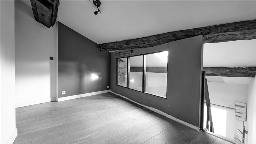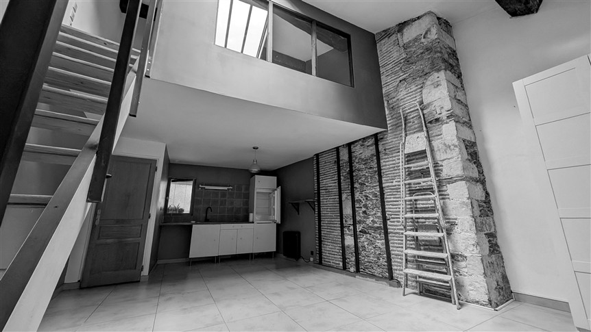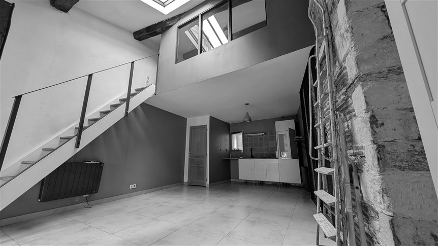 T2 en duplex de 41.50 m² (39.50 m² loi-Carrez) : pièce de vie avec belle hauteur sous plafond et murs en pierres,