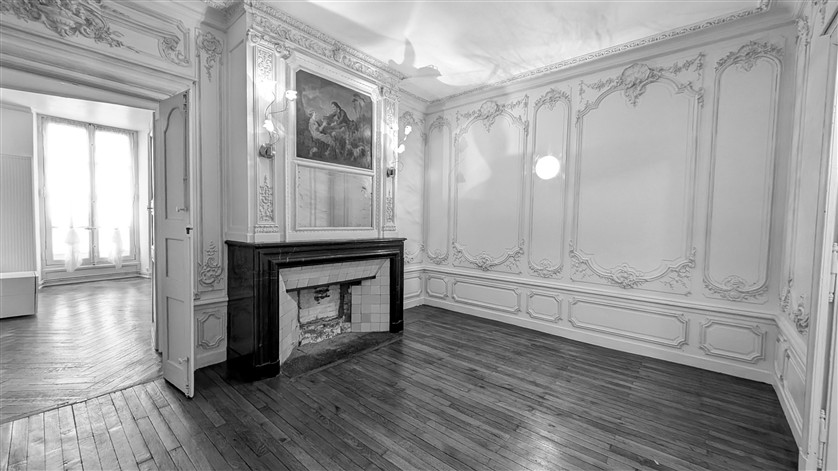 Entrée, double réception sur parquet avec cheminées et moulures,