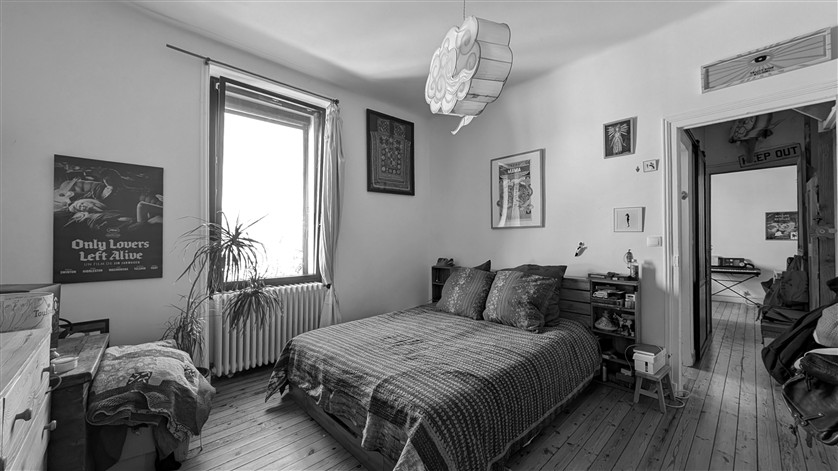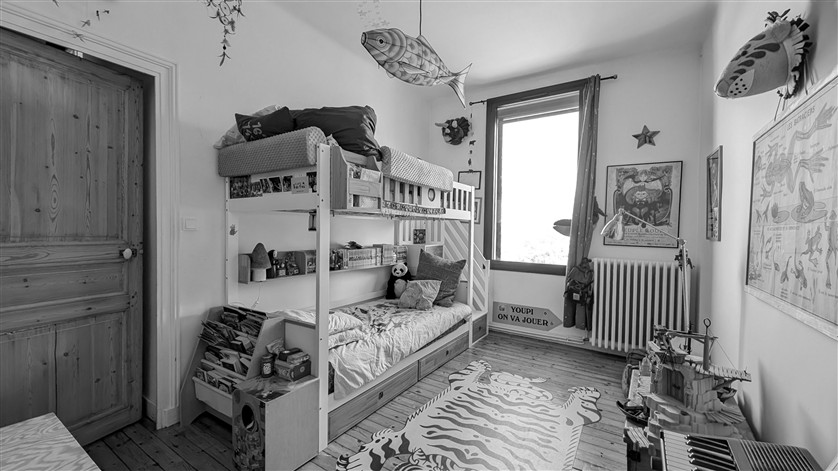 A l’étage : Deux grandes chambres, salle de bains avec WC.