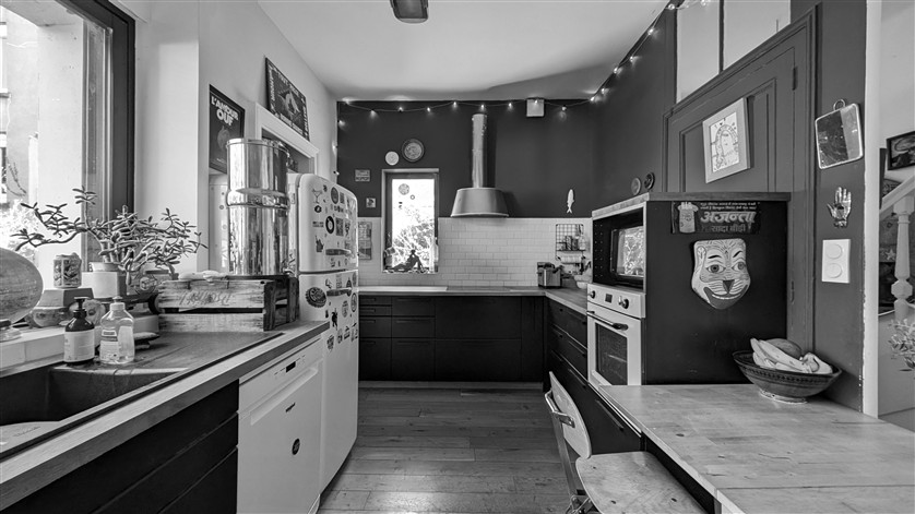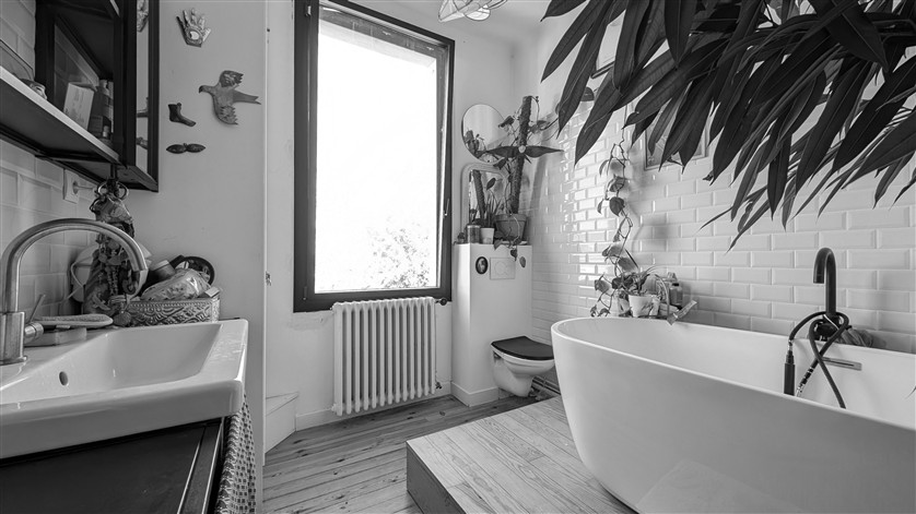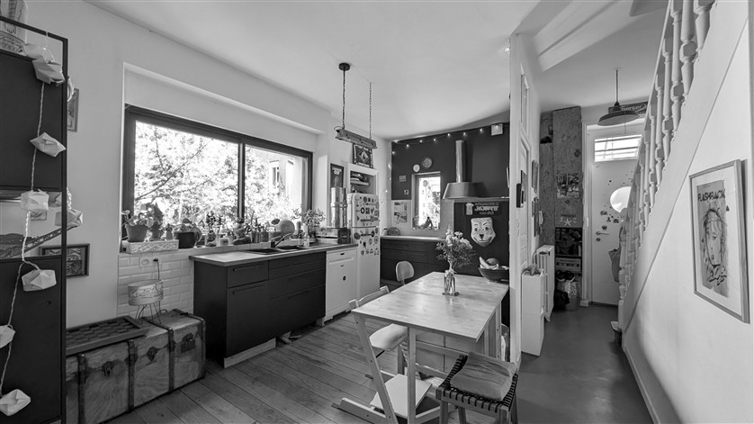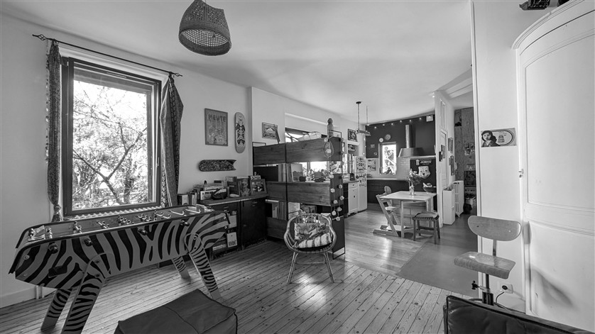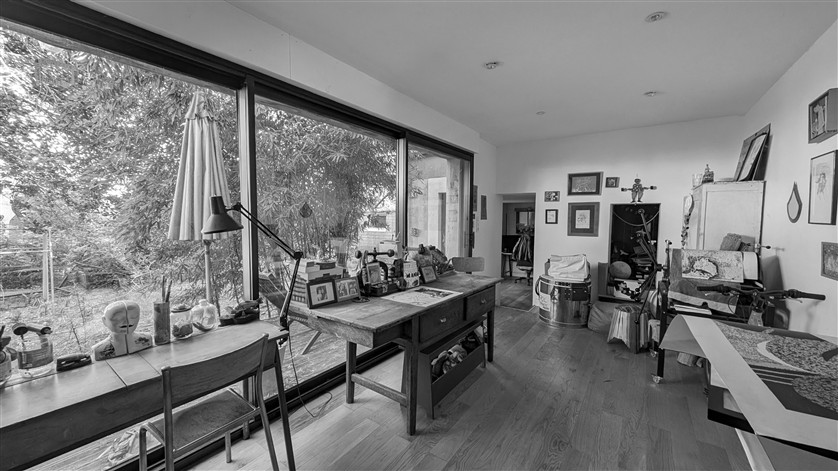 En rez-de-jardin : Un atelier éclairé par une grande baie vitrée, deux bureaux, buanderie et salle d’eau.