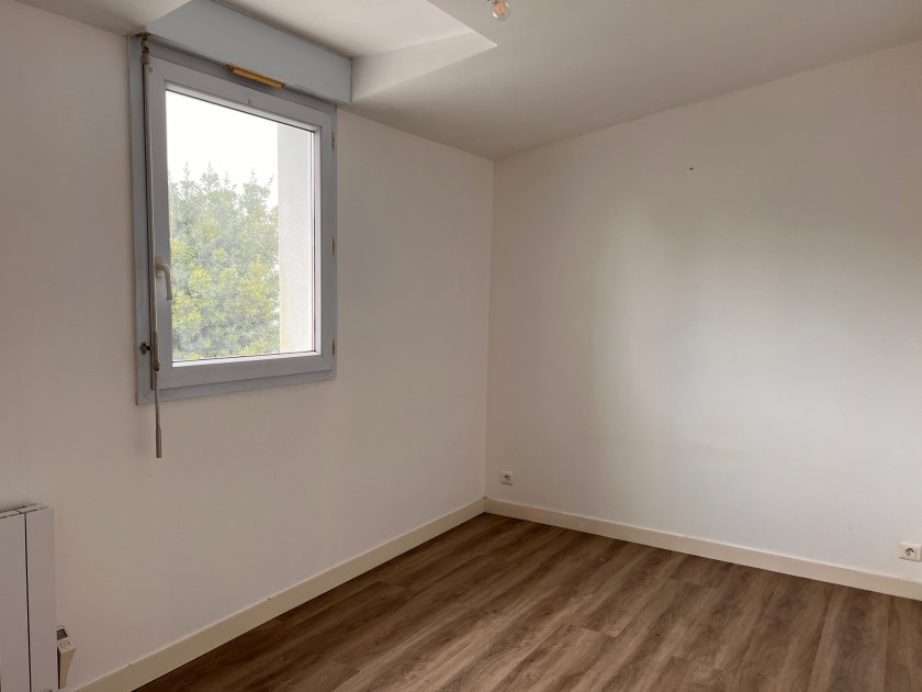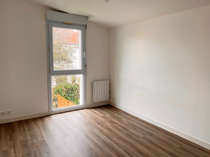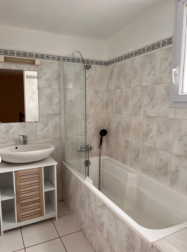 À l’étage : deux chambres, une salle de bain et un placard sur le palier.